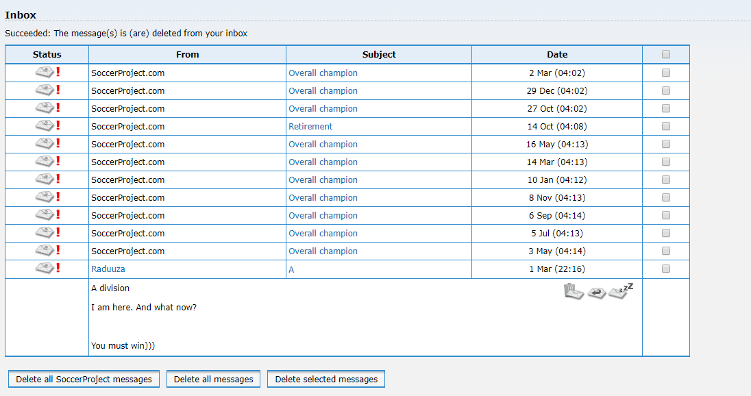 Uplakaná tlačovka môjho poľského súpera o áčkový titul spustila takú malú lavínku sťažností na random. Už asi 10 manažérov mi napísalo správu o tom, ako ich reže random a čo majú robiť a tak. Jednému nemenovanému rumunskému "kamarátovi" som neodpísal, ale správu rovno zmazal (nemám chuť komunikovať s čurákmi). A prišla mi od neho druhá správa, ktorá proste už stojí za zverejnenie na fóre (podotýkam, že s tým tímom som snáď nikdy nehral žiadny zápas)